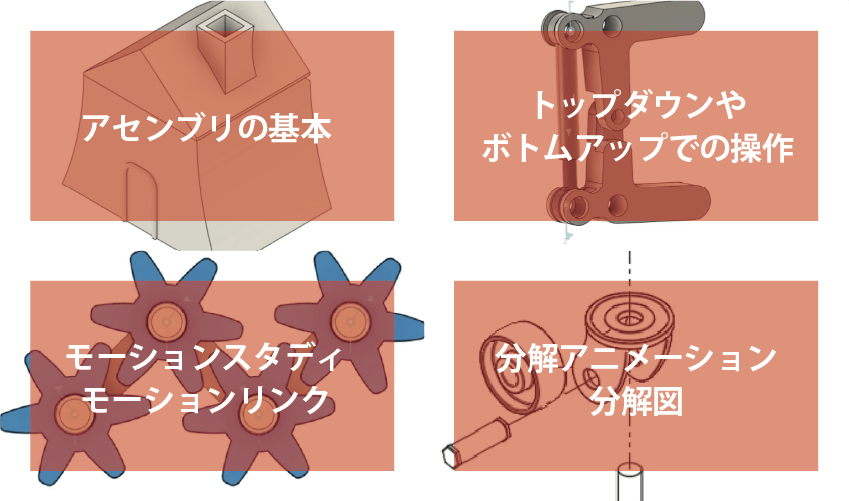 Fusion360のアセンブリを基礎からしっかり学びます。3DCADで設計をする上で必須になるのが、部品を組み合わせるアセンブリの理解です。この科目では複数の部品を組み合わせる、トップダウンやボトムアップ設計での操作。また、ジョイントによるアニメーションや部品同士の関連付け、干渉などFusion360のアセンブリ機能をしっかり学びますさらに、よくある失敗操作を実際に体験しアセンブリを深く理解できる構成になっています。